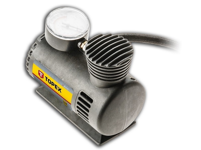 TOPEX 12 V-os légkompresszor, a gépkocsi akkumulátoráról működtethető. Szolid műanyag házzal, manométerrel és tartozék fúvókákkal gumimatracok, labdák és hasonlók felfújásához. Nélkülözhetetlen minden gépkocsivezető számára, hasznos a garázsban és útközben is. A CE tanúsítvány igazolja az európai biztonsági normáknak való megfelelést. A TOPEX márka ezermestereknek készül.