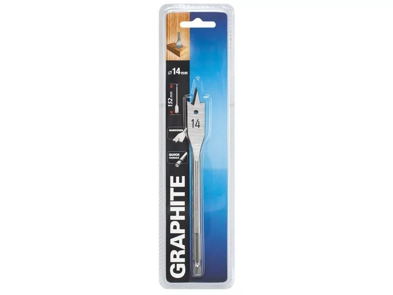 A GRAPHITE laposfúrószár fához a vágóél különleges kialakításának köszönhetően lehetővé teszi a fúrási sebesség megduplázását, valamint elkerülhetővé teszi az anyag felszakítását. A „Quick Change” típusú hatlapú szárvég lehetővé teszi a fúrószár használatát a mágneses befogókkal felszerelt akkumulátoros csavarozókban.