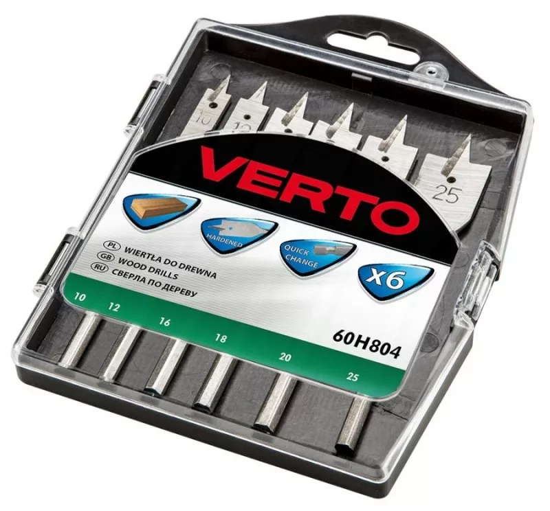 A VERTO laposfúrószár készlet fához (kat. sz. 60H804) 6.0 mm és 25 mm közötti mérettartopmányban a vágóél különleges kialakításának köszönhetően lehetővé teszi a fúrási sebesség megduplázását, valamint elkerülhetővé teszi az anyag felszakítását. A hatlapú szárvég lehetővé teszi a fúrószár használatát a mágneses befogókkal felszerelt akkumulátoros csavarozókban is.