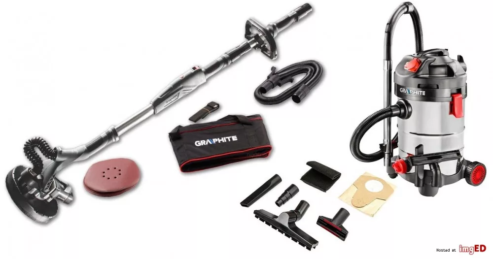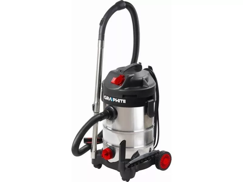 Az 1 500 W teljesítményű GRAPHITE professzionális műhelyporszívó (kat. sz. 59G607) a műhelyben keletkező forgács, fűrészpor gyors és hatékony eltávolítására szolgál. A bőséges, 30 literes rozsdamentes acél tartállyal ellátott porszívó száraz és nedves takarításhoz is használható. A nagy szívóerő – 18 kPa – és a 35 mm-es szívócső-vég átmérő a legkülönbözőbb hulladékok feltakarítását teszi lehetővé. A porszívó fúvásra is használható. Fel van szerelve úszós biztonsági szeleppel, valamint szennyezett víz leeresztő szeleppel a nedves takarítás biztonságossága érdekében. A nagy méretű hátsó járókerekekkel és az ütközőkkel védett első járókerekekkel biztonságosan mozgatható a berendezés nehéz körülmények között is. A porszívóra szerelt elektromos csatlakozóaljzathoz max. 2 000 W teljesítményfelvételű elektromos kéziszerszámok csatlakoztathatók. A háromállású indítókapcsolóval lehetőség van a porszívó vezérlésére a csatlakoztatott elektromos kéziszerszám szintjéről, vagy a porszívó önálló működtetésére. A porszívóhoz hosszúságában szabályozható fém szívócső tartozik. A cserélhető takarító tartozékok a berendezés talpazatában tárolhatók. A műhelyporszívóhoz mellékelt tartozékok: szívótömlő, takarító tartozékok, teleszkópos szívócső, porzsák, habszivacs szűrő, szűrőpatron, kábeltartó, adapter. A CE tanúsítvány bizonyítja az európai szabványoknak való megfelelést.