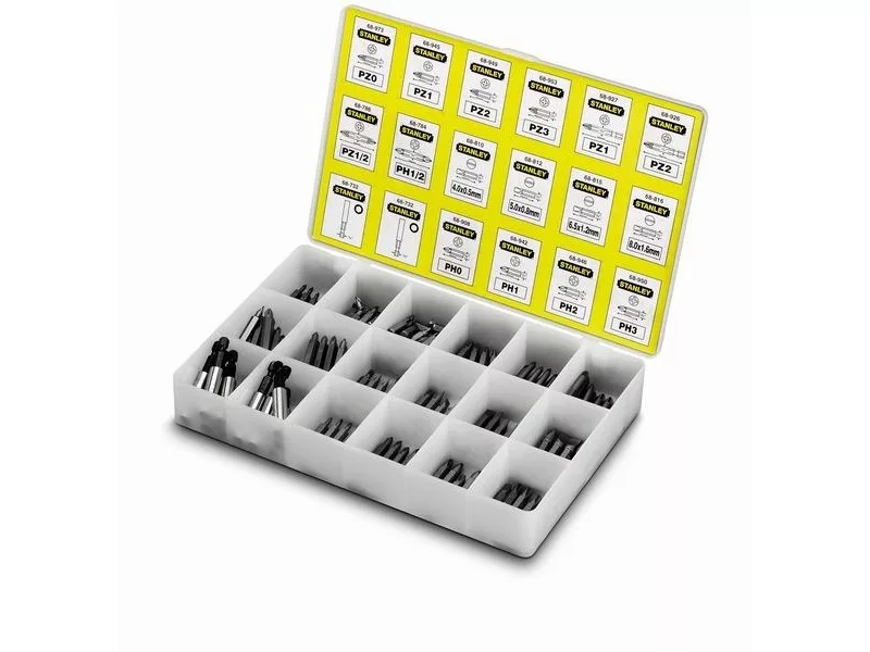 • Pozidrive 10 x n°0 x 25 mm, Pozidrive 20 x n°1 x 25 mm,Pozidriv 30 x n°2 x 25 mm, Pozidrive 10 x n°3 x 25 mm, Pozidrive 10 x n°1 x 50 mm, Pozidrive 10 x n°2 x 50 mm, Pozidrive 10 x n°1+ 2 x 60 mm, Philips 10 x n°0 x 25 mm, Philips 10 x n°1 x 25 mm, Philips 10 x n°2 x 25 mm, Philips 10 x n°3 x 25 mm, Philips 10 x n°1+2 x 60mm, Standard 10 x 4 x 0