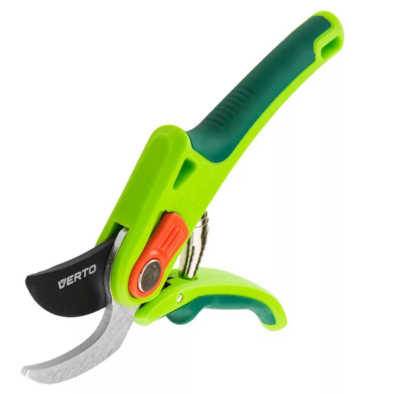 VERTO Univerzális kerti metszőolló vágási átmérő max. 12 mm. By-pass típusú metszőolló, ágak és cserjék metszésére használható. Az élt teflon bevonat borítja, védve a korróziótól. Az élek blokádja megakadályozza a véletlenszerű kinyitást. A műanyagból készült ergonomikus fogantyú csúszásgátlóval van ellátva, ami biztosítja a munkavégzés biztonságát és komfortját. A szabályozható fogantyú révén jól illik a női kezekbe is.