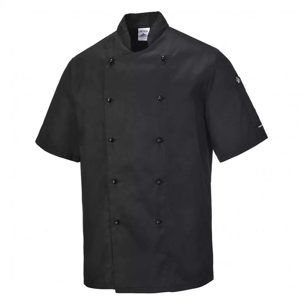 - Klasszikus szabású, rövidujjú séfkabát.
