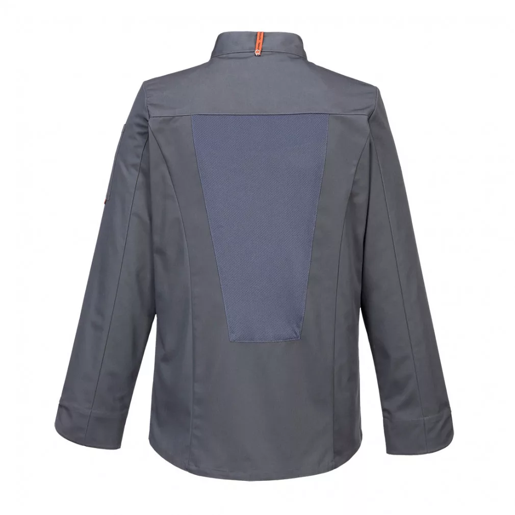 Ez a séf kabát ergonomikus viseletett és karcsú sziuletett biztosít. Dupla gombos rejtett zárodás. Kötény akasztó fül a nyak hátsó részén. A nagy méretű MeshAir Pro panelek amik kiváló légáteresztést biztosítanak. Rejtett patentos záródás Francia mandzsetta Ujjzseb MeshAir™ szellőző hálós kialakítású Poliészter/Pamut Texpel szövet. 1 ujjzseb. Slim fit szabás.