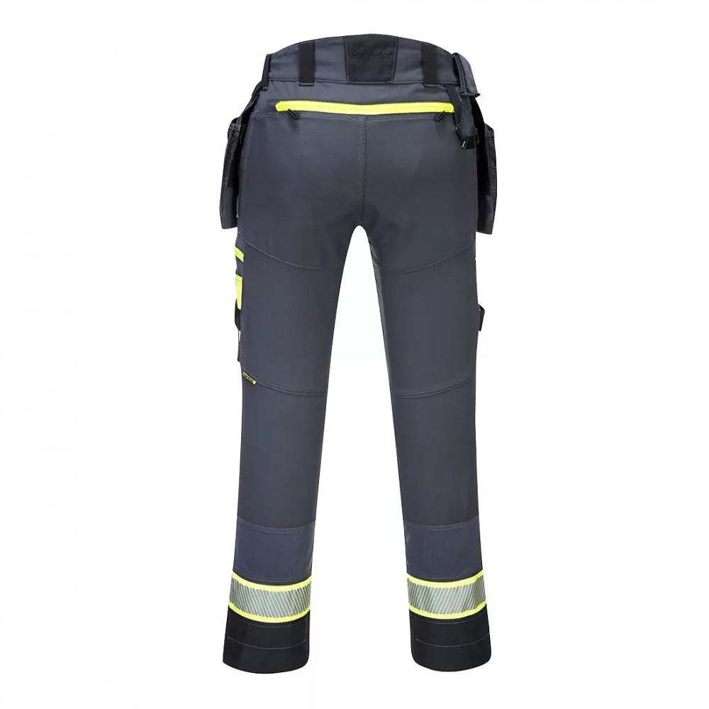 A DX4 lengőzsebes nadrág ergonómikus kialakítású mely dinamikus 4X stretch panelekkel biztosítja a maximális mozgásszabadságot. A nadrág emelt derék- és elasztikus oldalrésszel rendelkezik melyek kiváló komfortot biztosítanak minden munkapozícióban. Felülről behelyezhető térdpárna tartó zseb nagyméretű elülső és többfunkciós cipzáras zsebek biztosítják a telefon tollak és szerszámok biztonságos tárolását. A háromszoros varrások maximális tartósságot biztosítanak. UPF 50+ Új modell Vonalzótartó zseb Háromszoros varrás Kalapács hurok Egyedi innovatív zsebkialakítás Okostelefon tartó Többféle cipzáros rekesz Fényvisszaverő csíkozás Oldalt gumírozott derék Felső nyílású térdzsebek D gyűrű Többfunkciós tárolózsebek 16 zseb Hátsó cipzáras zseb Aktív illeszkedés Állítható szárhossz Minden fontos helyen megerősített Két rétegű térdvédő zsebek HiVisTex Pro fényvisszaverő szalag Megerősített panelek 4 utas rugalmas anyag Regisztrált európai közösségi design Modern ergonomikus kialakítás Magasított derék Ágyék erősítés cipzár húzó Portwest logóval