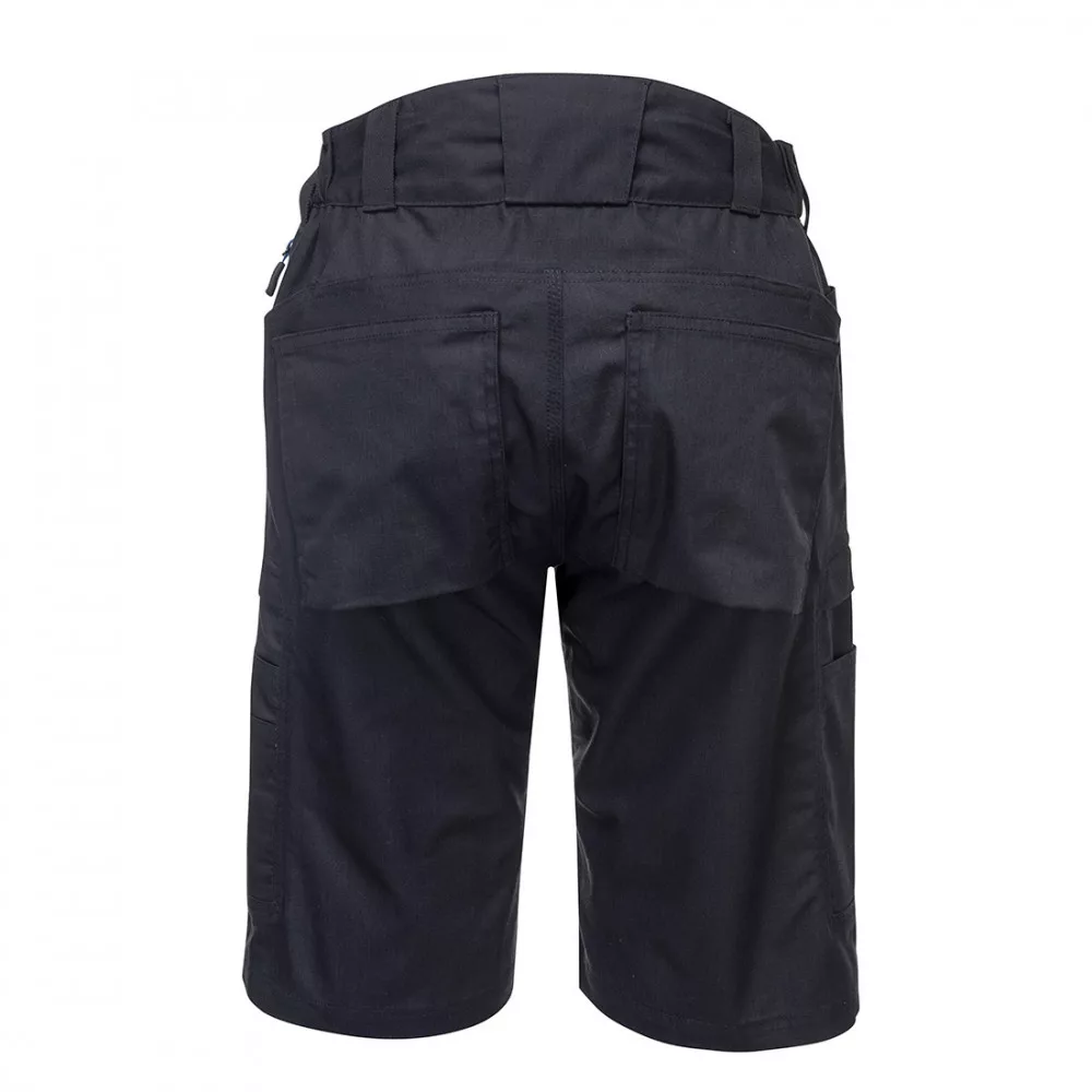 Modern munka short amely rendkívülstrapabíró ripstop anyagból készült és kiválómozgásszabadságot biztosít. Olyan funkciókat biztosít mintpéldául az elasztikus panelek magasított derék kialakítás amelyeknek köszönhetően minden munkakörnyezetben védelmet nyújt. A többfunkciós combzsebek biztosítják a telefonok tollak és egyéb eszközök biztonságos tárolását. UPF 50+ Új modell Vonalzótartó zseb Háromszoros varrás Okostelefon tartó Oldalt gumírozott derék 11 zseb Minden fontos helyen megerősített Modern ergonomikus kialakítás Magasított derék Ágyék erősítés cipzár húzó Portwest logóval Szövet öv hurok cipzáras oldalsó zseb Stretch ripstop Kiváló tapadású cipzár húzó