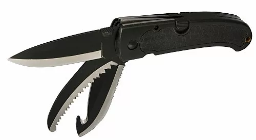Kés multifunkcionális fekete SHARK. A zárt kés hossza 130 mm. Kés 3 különböző részből áll, különböző felhasználási célokra. A fogantyú műanyag és gumi kombinációja. Súlya 0,164 kg.