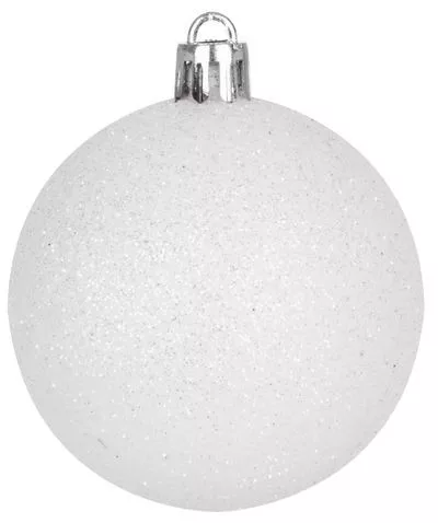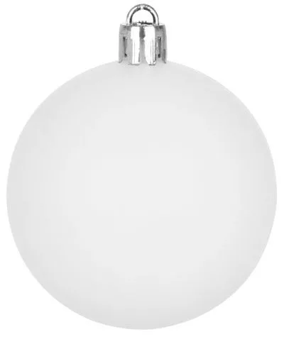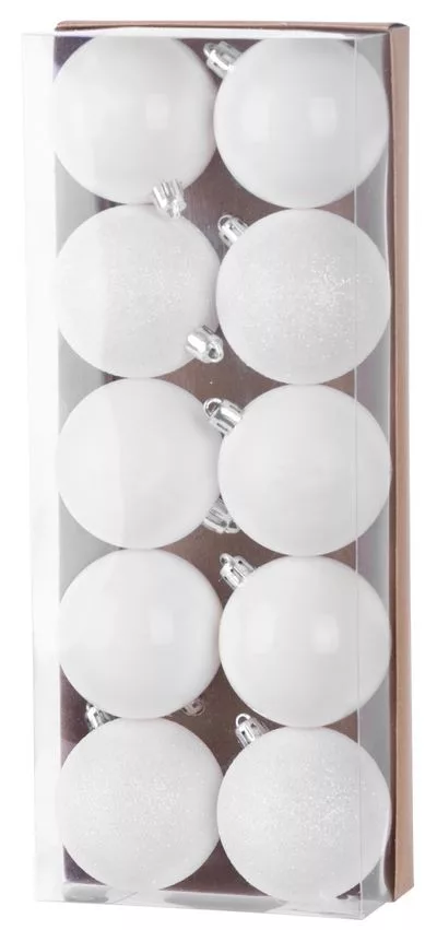A karácsonyfa díszkészlet a karácsonyfa ünnepi díszítésére szolgál. 10 db 6 cm átmérőjű karácsonyi gömbből áll. A gömbök színe fehér. Műanyagból készült.
