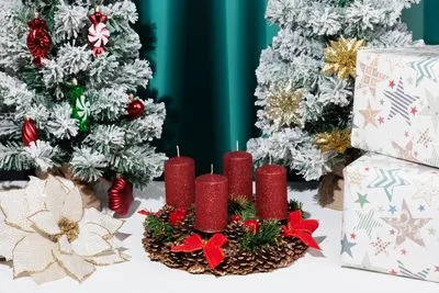 Gyertya MagicHome Karácsony, 4,8x8 cm, hengeres, csomag 4 db, piros, csillámokkal, adventi