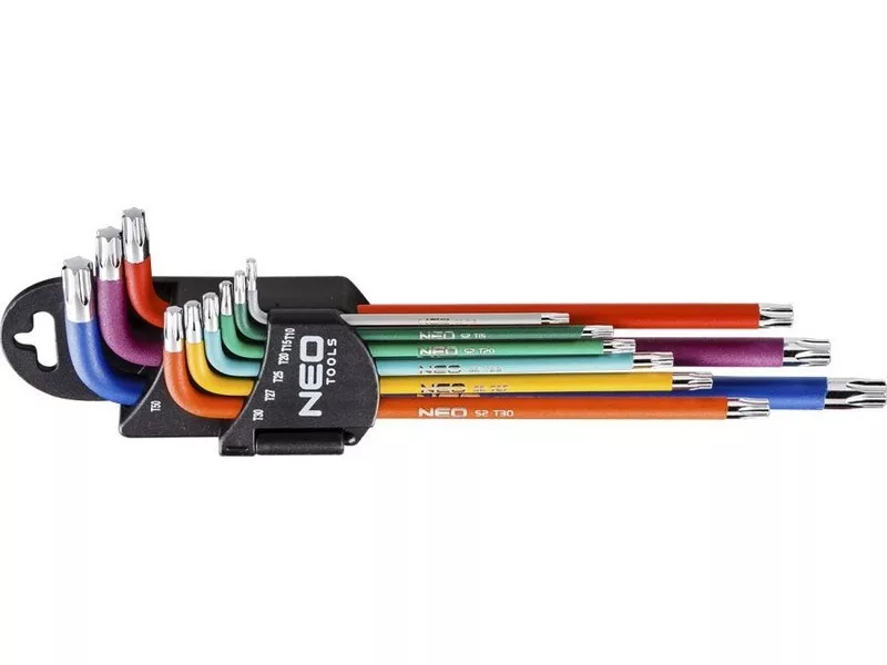 NEO Torx kulcskészlet 9 db kulccsal, T10 – T50 közötti méretekben. A kiváló minőségű SNCM+V acél sokéves tartósságot biztosít. Minden kulcsméret más színnel jelölt, ami megkönnyíti a feladathoz megfelelő méret kiválasztását. A készlet praktikus csomagolásban kapott helyet. A termék megbízhatóságát bizonyítja a 25 éves jótállás. A NEO márka a professzionális igényeket is kielégíti.