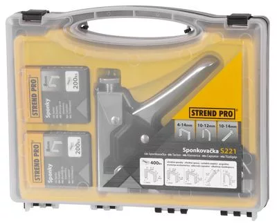 A Strend Pro kézi tűzőgépet anyagok tűzőkapcsokkal történő összekapcsolására tervezték. Ez egy robusztus és erős eszköz, amellyel könnyedén rögzíthet különféle anyagokat, mint például szövet, kárpit, karton, keretek stb. Alkalmas C típusú klipekhez 4-14 mm szélességben 10,6 és 11,3 mm, D 10-12 mm, B szeg 10-14 mm. A praktikus műanyag dobozos csomagolás 400 db C 8 mm-es kapcsot is tartalmaz.