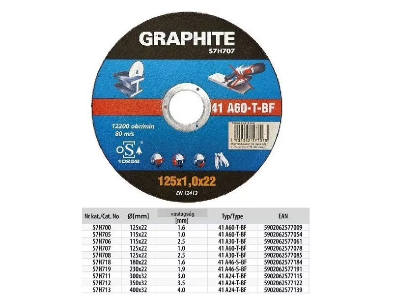 A GRAPHITE fémvágó tárcsa előrehaladott szerkezete és vastagság csökkentése révén lehetővé teszi a vágáshoz szükséges idő jelentős lerövidítését. A termék megfelelése az EN 12413 szabványnak biztosítja a munkavégzés magas fokú biztonságát.
