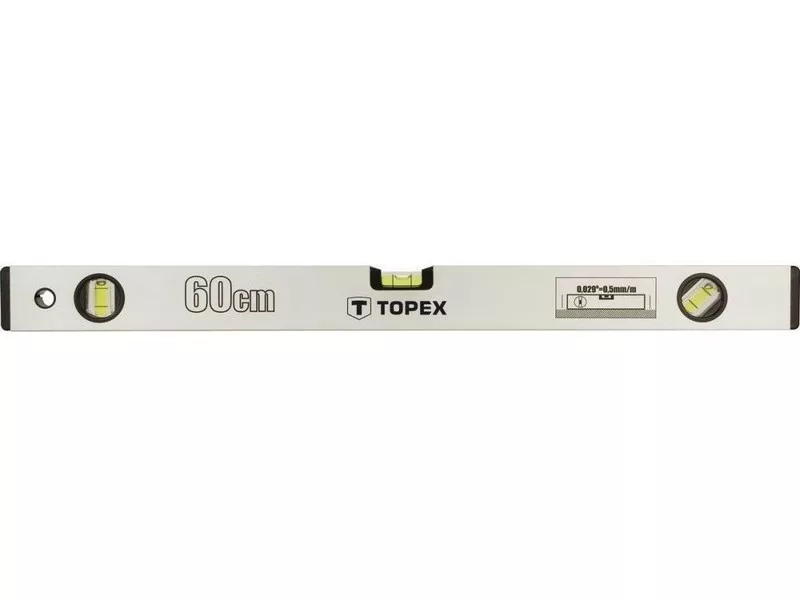 TOPEX anodizált alumínium vízszintező, mérési pontossága ±0,5 mm/m. 3 libellával felszerelt. Strapabíró alumínium ötvözetből készül Az anodizálás védi a korrózió és a sérülések ellen a felületét. A TOPEX márka ezermestereknek készül.